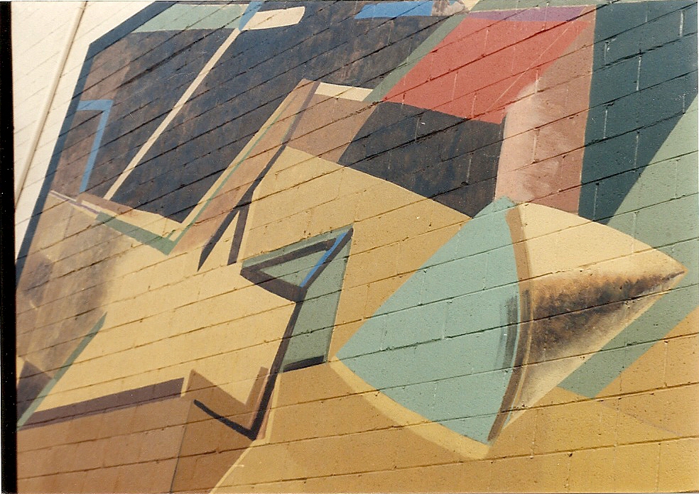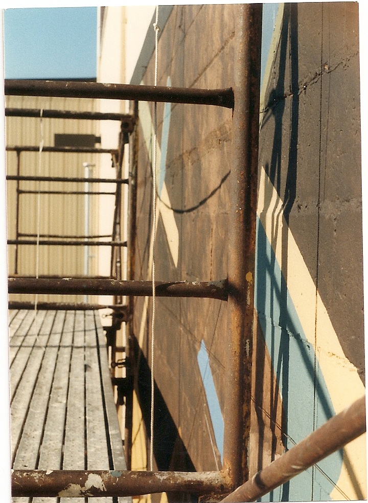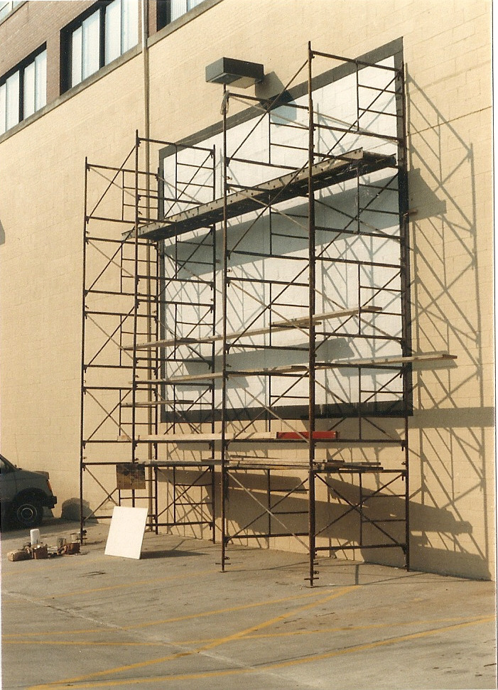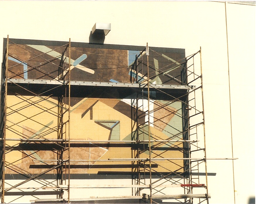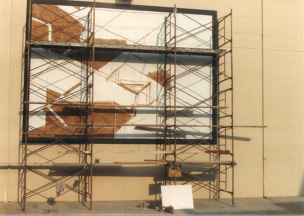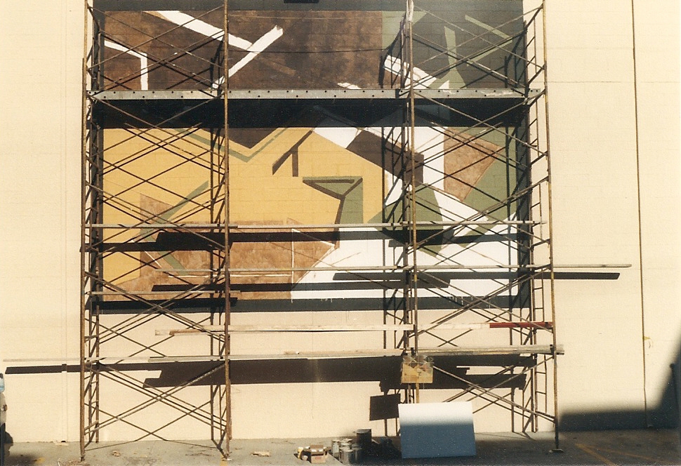 A casual conversation between two friends as the mural was underway. Parkersburg Mural, old Public Debt building 1988.